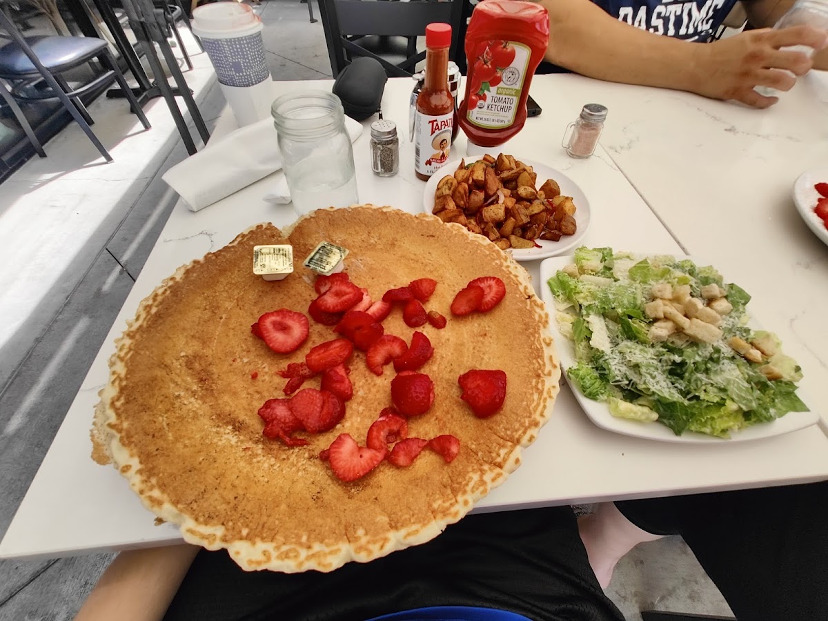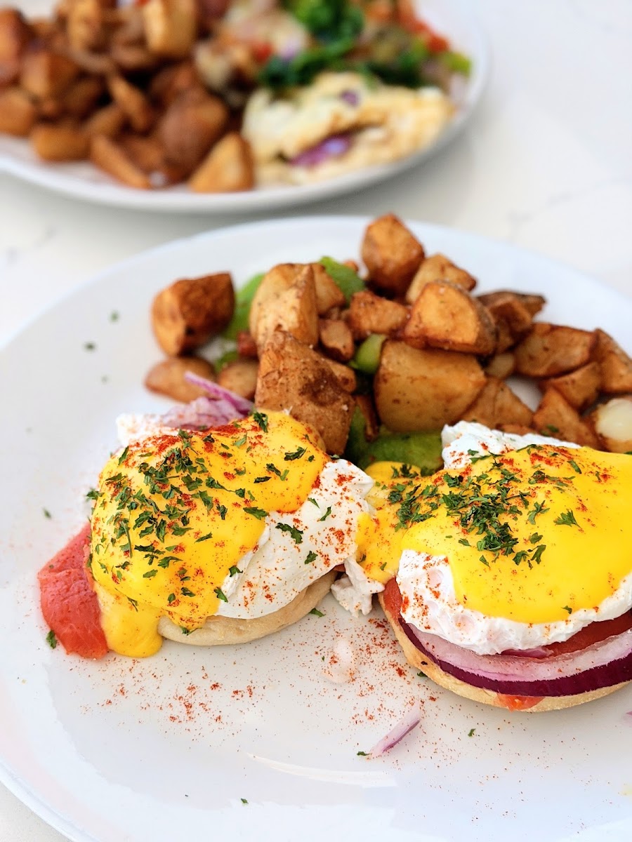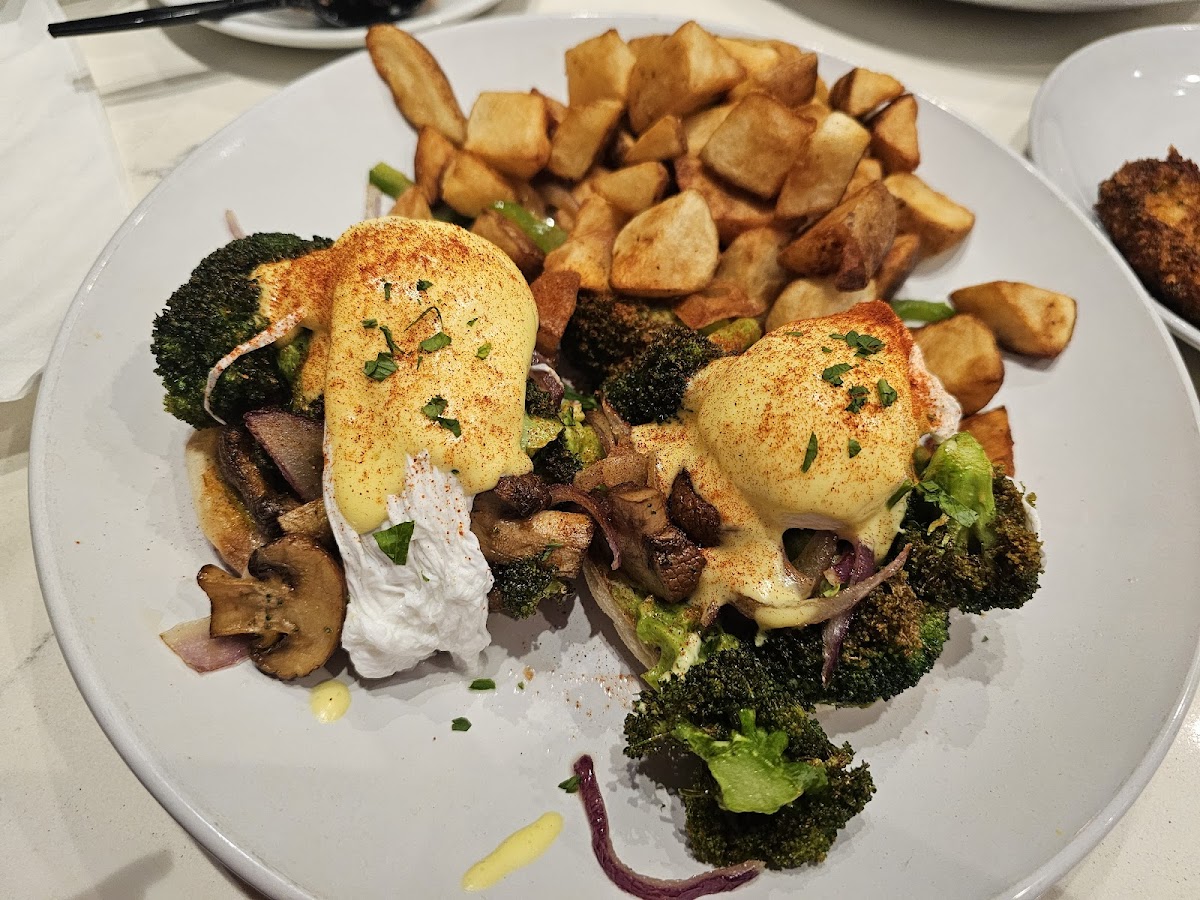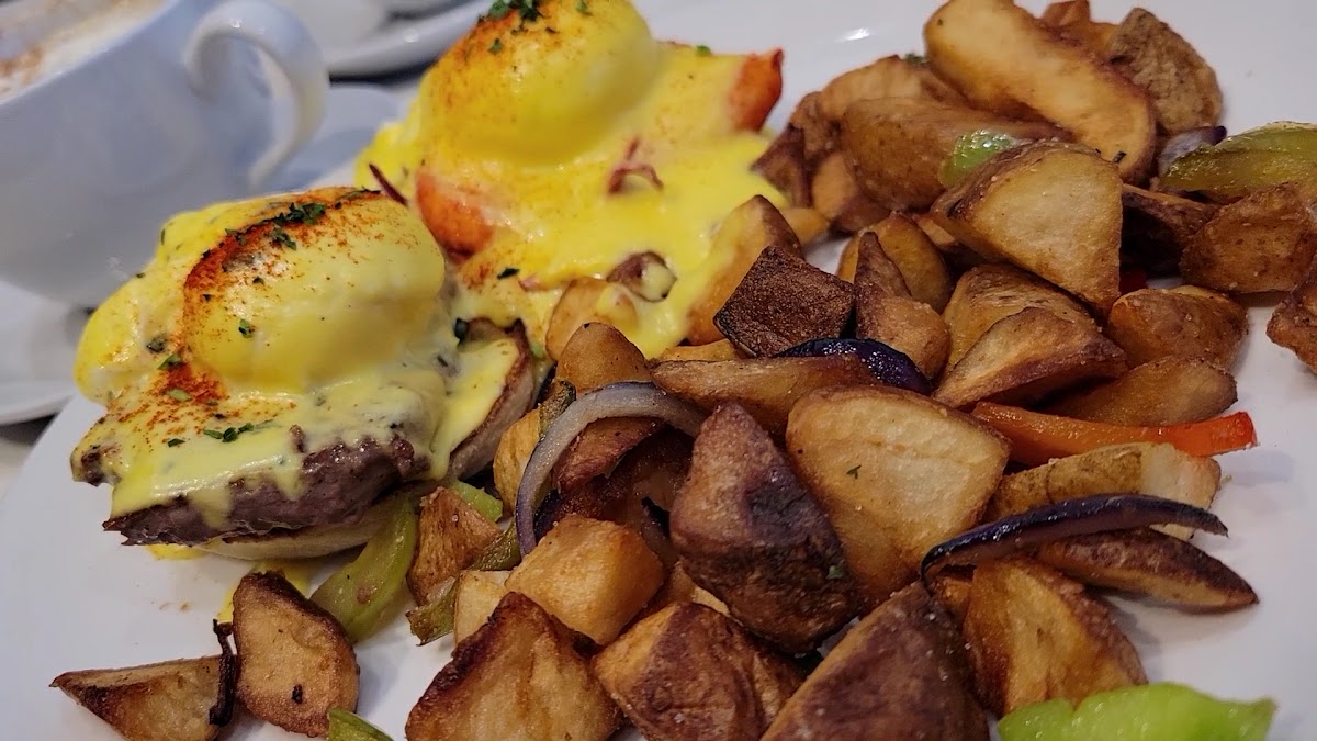 We finally had an opportunity to eat here, and it was ok overall. Food: we went with the house and surf n turf eggs Benedict (EB) and the chocolate chip pancake (for our son). The house EB was the better of the two and was enjoyable. The surf was good, but the turf was blan and could have been more flavorful. My gripe for the EB's was that the vinegar flavor was too strong on the poached egg. It added a sourness that was off-putting. My son had no complaints about his pancake. The lavender lattes were tasty but not worth the price tag for the amount you get. Service: it was great. Our server was nice and courteous; I can't complain. This was probably the best part of the overall experience with our dine in experience. Atmosphere: it was ok. It needed some work but nothing to truly knock it for. Overall: i am glad we came and tried it. I would not go out of my way for it, but if I returned, I would order the House EB for sure.